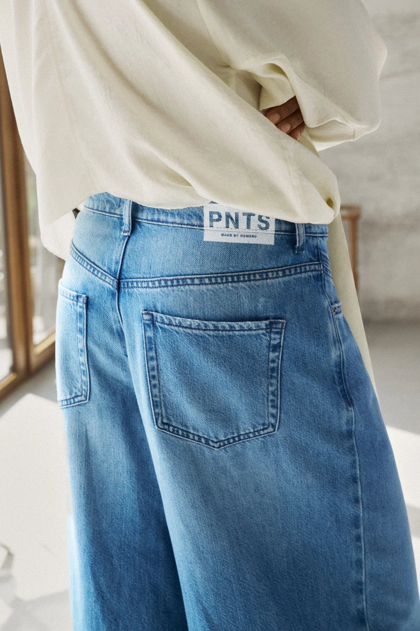 The denim 14_THE GENT comes in an authentic light organic denim quality. It is available in two different blue washes with lighter worn areas and integrated permanent crease effects. The Gent, designed in a classic 5-pocket style, features a front pleat at the waistband and a wide, extra-long leg. At the back, the jeans have patch pockets.