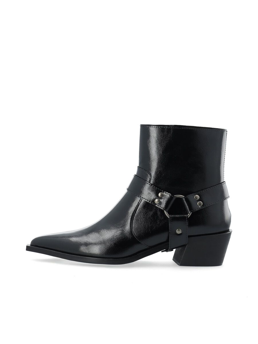 The Bianco BIAJODY Low Harness Boot Black is a stylish ankle boot inspired by classic biker and western designs. The boot features a sleek pointed toe and a decorative harness strap with metal hardware, giving it a bold and modern edge.